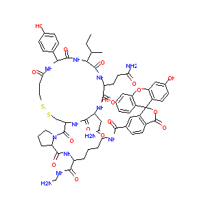 CCC(C)C1C(=O)NC(C(=O)NC(C(=O)NC(CSSCCC(=O)NC(C(=O)N1)C2<br />=CC=C(C=C2)O)C(=O)N3CCCC3C(=O)NC(CCCCNC(=O)C4=CC5=C(C=C<br />4)C(=O)OC56C7=C(C=C(C=C7)O)OC8=C6C=CC(=C8)O)C(=O)NCN)CC<br />(=O)N)CCC(=O)N