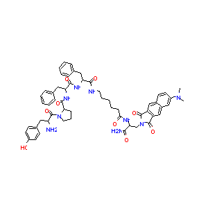 CN(C)C1=CC2=CC3=C(C=C2C=C1)C(=O)N(C3=O)CC(C(=O)N)NC(=O)<br />CCCCCNC(=O)C(CC4=CC=CC=C4)NC(=O)C(CC5=CC=CC=C5)NC(=O)C6<br />CCCN6C(=O)C(CC7=CC=C(C=C7)O)N