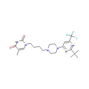 CC1=CN(C(=O)NC1=O)CCCCN2CCN(CC2)C3=NC(=NC(=C3)C(F)(F)F)<br />C(C)(C)C
