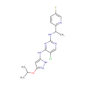 InChI=1S/C17H19ClFN7O/c1-9(2)27-15-6-14(25-26-15)23-16-12(18)8-21-17(24-16)22-10(3)13-5-4-11(19)7-20-13/h4-10H,1-3H3,(H3,21,22,23,24,25,26)