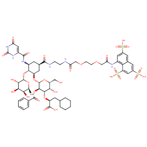 InChI=1S/C58H74N6O31S3/c1-27-45(69)47(71)48(72)56(90-27)95-49-35(62-53(74)36-23-41(66)64-58(78)63-36)19-31(20-37(49)92-57-51(94-55(77)29-10-6-3-7-11-29)50(46(70)39(24-65)93-57)91-38(54(75)76)16-28-8-4-2-5-9-28)52(73)60-13-12-59-42(67)25-88-14-15-89-26-43(68)61-34-21-32(96(79,80)81)17-30-18-33(97(82,83)84)22-40(44(30)34)98(85,86)87/h3,6-7,10-11,17-18,21-23,27-28,31,35,37-39,45-51,56-57,65,69-72H,2,4-5,8-9,12-16,19-20,24-26H2,1H3,(H,59,67)(H,60,73)(H,61,68)(H,62,74)(H,75,76)(H,79,80,81)(H,82,83,84)(H,85,86,87)(H2,63,64,66,78)/t27-,31+,35-,37+,38-,39+,45+,46-,47+,48-,49+,50-,51+,56-,57+/m0/s1