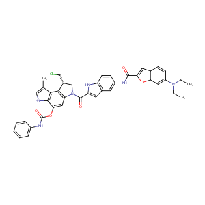 CCN(CC)c1ccc2cc(oc2c1)C(=O)Nc3ccc4[nH]c(cc4c3)C(=O)N5C[<br />C@@H](CCl)c6c5cc(OC(=O)Nc7ccccc7)c8[nH]cc(C)c68