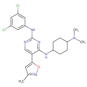 InChI=1S/C22H26Cl2N6O/c1-13-8-20(31-29-13)19-12-25-22(27-17-10-14(23)9-15(24)11-17)28-21(19)26-16-4-6-18(7-5-16)30(2)3/h8-12,16,18H,4-7H2,1-3H3,(H2,25,26,27,28)