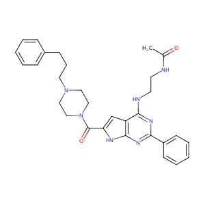 InChI=1S/C30H35N7O2/c1-22(38)31-14-15-32-28-25-21-26(33-29(25)35-27(34-28)24-12-6-3-7-13-24)30(39)37-19-17-36(18-20-37)16-8-11-23-9-4-2-5-10-23/h2-7,9-10,12-13,21H,8,11,14-20H2,1H3,(H,31,38)(H2,32,33,34,35)