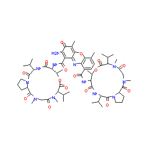 CC1C(C(=O)NC(C(=O)N2CCCC2C(=O)N(CC(=O)N(C(C(=O)O1)C(C)C<br />)C)C)C(C)C)NC(=O)C3=C4C(=C(C=C3)C)OC5=C(C(=O)C(=C(C5=N4<br />)C(=O)NC6C(OC(=O)C(N(C(=O)CN(C(=O)C7CCCN7C(=O)C(NC6=O)C<br />(C)C)C)C)C(C)C)C)N)C