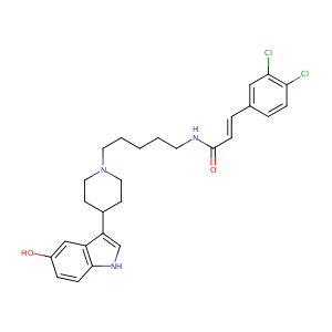 InChI=1S/C27H31Cl2N3O2/c28-24-7-4-19(16-25(24)29)5-9-27(34)30-12-2-1-3-13-32-14-10-20(11-15-32)23-18-31-26-8-6-21(33)17-22(23)26/h4-9,16-18,20,31,33H,1-3,10-15H2,(H,30,34)/b9-5+