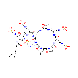 CCC(C)CCCCC(=O)NC(CCNCS(=O)(=O)[O-])C(=O)NC(C(C)O)C(=O)<br />NC(CCNCS(=O)(=O)[O-])C(=O)NC1CCNC(=O)C(NC(=O)C(NC(=O)C(<br />NC(=O)C(NC(=O)C(NC(=O)C(NC1=O)CCNCS(=O)(=O)[O-])CC(C)C)<br />CC(C)C)CCNCS(=O)(=O)[O-])CCNCS(=O)(=O)[O-])C(C)O.[Na+].<br />[Na+].[Na+].[Na+].[Na+]