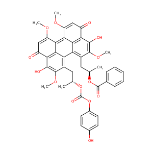 InChI=1S/C44H38O14/c1-20(56-43(50)22-10-8-7-9-11-22)16-25-31-32-26(17-21(2)57-44(51)58-24-14-12-23(45)13-15-24)42(55-6)40(49)34-28(47)19-30(53-4)36(38(32)34)35-29(52-3)18-27(46)33(37(31)35)39(48)41(25)54-5/h7-15,18-21,45,48-49H,16-17H2,1-6H3/t20-,21-/m1/s1