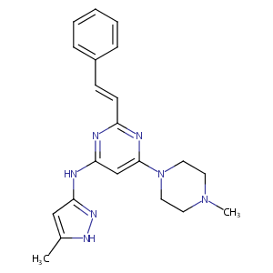 InChI=1S/C21H25N7/c1-16-14-20(26-25-16)23-19-15-21(28-12-10-27(2)11-13-28)24-18(22-19)9-8-17-6-4-3-5-7-17/h3-9,14-15H,10-13H2,1-2H3,(H2,22,23,24,25,26)/b9-8+