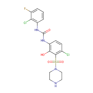 InChI=1S/C17H17Cl2FN4O4S/c18-10-4-5-13(23-17(26)22-12-3-1-2-11(20)14(12)19)15(25)16(10)29(27,28)24-8-6-21-7-9-24/h1-5,21,25H,6-9H2,(H2,22,23,26)
