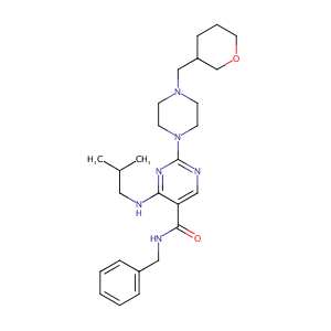 InChI=1S/C26H38N6O2/c1-20(2)15-27-24-23(25(33)28-16-21-7-4-3-5-8-21)17-29-26(30-24)32-12-10-31(11-13-32)18-22-9-6-14-34-19-22/h3-5,7-8,17,20,22H,6,9-16,18-19H2,1-2H3,(H,28,33)(H,27,29,30)