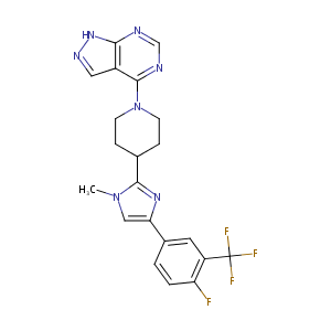 InChI=1S/C21H19F4N7/c1-31-10-17(13-2-3-16(22)15(8-13)21(23,24)25)29-19(31)12-4-6-32(7-5-12)20-14-9-28-30-18(14)26-11-27-20/h2-3,8-12H,4-7H2,1H3,(H,26,27,28,30)