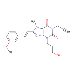 InChI=1S/C21H22N4O4/c1-4-11-25-20(27)18-19(24(21(25)28)12-6-13-26)22-17(23(18)2)10-9-15-7-5-8-16(14-15)29-3/h1,5,7-10,14,26H,6,11-13H2,2-3H3/b10-9+