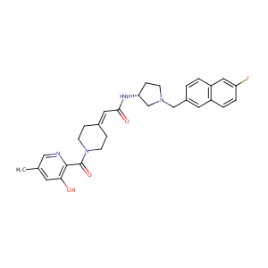 InChI=1S/C29H31FN4O3/c1-19-12-26(35)28(31-16-19)29(37)34-10-6-20(7-11-34)14-27(36)32-25-8-9-33(18-25)17-21-2-3-23-15-24(30)5-4-22(23)13-21/h2-5,12-16,25,35H,6-11,17-18H2,1H3,(H,32,36)/t25-/m1/s1