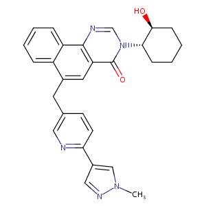 InChI=1S/C28H27N5O2/c1-32-16-20(15-31-32)24-11-10-18(14-29-24)12-19-13-23-27(22-7-3-2-6-21(19)22)30-17-33(28(23)35)25-8-4-5-9-26(25)34/h2-3,6-7,10-11,13-17,25-26,34H,4-5,8-9,12H2,1H3/t25-,26-/m0/s1