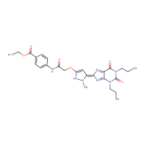 InChI=1S/C26H31N7O6/c1-5-12-32-23-21(24(35)33(13-6-2)26(32)37)28-22(29-23)18-14-20(30-31(18)4)39-15-19(34)27-17-10-8-16(9-11-17)25(36)38-7-3/h8-11,14,30H,5-7,12-13,15H2,1-4H3,(H,27,34)/b22-18-