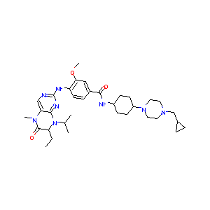 InChI=1S/C34H50N8O3/c1-6-28-33(44)39(4)29-20-35-34(38-31(29)42(28)22(2)3)37-27-14-9-24(19-30(27)45-5)32(43)36-25-10-12-26(13-11-25)41-17-15-40(16-18-41)21-23-7-8-23/h9,14,19-20,22-23,25-26,28H,6-8,10-13,15-18,21H2,1-5H3,(H,36,43)(H,35,37,38)/t25-,26-,28-/m1/s1