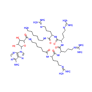 C1=NC2=C(C(=N1)N)N=CN2C3C(C(C(O3)C(=O)NCCCCCC(=O)NC(CCC<br />N=C(N)N)C(=O)NC(CCCN=C(N)N)C(=O)NC(CCCN=C(N)N)C(=O)NC(C<br />CCN=C(N)N)C(=O)NCCCCCCN)O)O