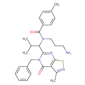 InChI=1S/C28H33N5O2S/c1-18(2)24(32(16-8-15-29)27(34)22-13-11-19(3)12-14-22)25-30-26-23(20(4)31-36-26)28(35)33(25)17-21-9-6-5-7-10-21/h5-7,9-14,18,24H,8,15-17,29H2,1-4H3