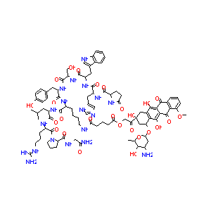 CC1C(C(CC(O1)OC2CC(CC3=C(C4=C(C(=C23)O)C(=O)C5=C(C4=O)C<br />=CC=C5OC)O)(C(=O)COC(=O)CCCC(=O)NCCCCC(C(=O)NC(CC(C)C)C<br />(=O)NC(CCCNC(=N)N)C(=O)N6CCCC6C(=O)NCC(=O)N)NC(=O)C(CC7<br />=CC=C(C=C7)O)NC(=O)C(CO)NC(=O)C(CC8=CNC9=CC=CC=C98)NC(=<br />O)C(CC1=CN=CN1)NC(=O)C1CCC(=O)N1)O)N)O
