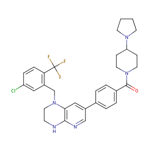 InChI=1S/C31H33ClF3N5O/c32-25-7-8-27(31(33,34)35)24(17-25)20-40-16-11-36-29-28(40)18-23(19-37-29)21-3-5-22(6-4-21)30(41)39-14-9-26(10-15-39)38-12-1-2-13-38/h3-8,17-19,26H,1-2,9-16,20H2,(H,36,37)