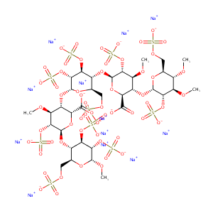 [C@H]1([C@H]([C@@H](O[C@@H]2[C@@H](O[C@H]([C@@H]([C@H]2<br />OC)OS(=O)(=O)[O-])O[C@H]2[C@@H]([C@H]([C@H](O[C@@H]2COS<br />(=O)(=O)[O-])OC)OS(=O)(=O)[O-])OS(=O)(=O)[O-])C(=O)[O-]<br />)O[C@@H]([C@H]1O[C@H]1[C@@H]([C@H]([C@@H]([C@H](O1)C(=O<br />)[O-])O[C@@H]1[C@@H]([C@H]([C@@H]([C@H](O1)COS(=O)(=O)[<br />O-])OC)OC)OS(=O)(=O)[O-])OC)OS(=O)(=O)[O-])COS(=O)(=O)[<br />O-])OS(=O)(=O)[O-])OS(=O)(=O)[O-].[Na+].[Na+].[Na+].[Na<br />+].[Na+].[Na+].[Na+].[Na+].[Na+].[Na+].[Na+].[Na+]