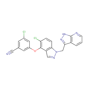 Clc1cc(Oc2c(Cl)ccc3c2cnn3Cc4n[nH]c5ncccc45)cc(c1)C#N