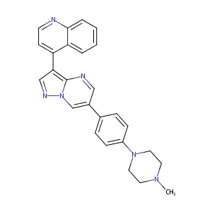 Ref 532338Synthesis and structure-activity relationships of a novel and selective bone morphogenetic protein receptor (BMP) inhibitor derived from the pyrazolo[1.5-a]pyrimidine scaffold of dorsomorphin: the discovery of ML347 as an ALK2 versus ALK3 selective MLPCN probe. Bioorg Med Chem Lett. 2013 Jun 1;23(11):3248-52.