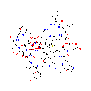 CCC(C)C(C(=O)NC(C(C)CC)C(=O)NC(CC1=CNC2=CC=CC=C21)C(=O)<br />OC(=O)C(CC(=O)O)NC(=O)C(CC(C)C)NC(=O)C(CC3C=NC=N3)NC(=O<br />)C(C)NC(=O)C(CC4=CC=CC=C4)NC(=O)C(CC5=CC=C(C=C5)O)NC(=O<br />)C(C(C)C)NC(=O)C(C)NC(=O)C(CCC(=O)OC(=O)C(CC(C)C)NC(=O)<br />C(CO)NC(=O)C(CO)NC(=O)C(C)NC(=O)C(CO)NC(=O)C(C)N)NC(=O)<br />C(CCCCN)NC(=O)C(CC(=O)O)NC(=O)C(CCSC)N)N