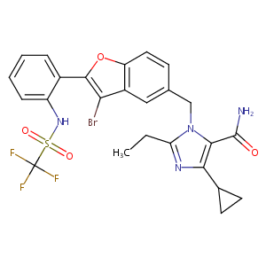 InChI=1S/C25H22BrF3N4O4S/c1-2-19-31-21(14-8-9-14)22(24(30)34)33(19)12-13-7-10-18-16(11-13)20(26)23(37-18)15-5-3-4-6-17(15)32-38(35,36)25(27,28)29/h3-7,10-11,14,32H,2,8-9,12H2,1H3,(H2,30,34)