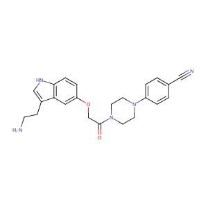 InChI=1S/C23H25N5O2/c24-8-7-18-15-26-22-6-5-20(13-21(18)22)30-16-23(29)28-11-9-27(10-12-28)19-3-1-17(14-25)2-4-19/h1-6,13,15,26H,7-12,16,24H2