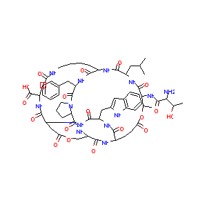 CC1C(C(=O)NC(C(=O)NC2CCCCNC(=O)CC(NC(=O)C3CC(=O)OCC(C(=<br />O)NC(CCC(=O)O1)C(=O)NC(C(=O)N3)CC4=CC5=CC=CC=C5N4)NC(=O<br />)C6CCCN6C(=O)C(NC2=O)CC7=CC=CC=C7)C(=O)O)CC(C)C)NC(=O)C<br />(C(C)O)N