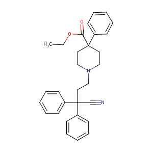 Difenossilato; Difenoxilato; Diphenoxalate; Diphenoxylatum; Difenossilato [DCIT]; Difenoxilato [Spanish]; Diphenoxylate HCl; Diphenoxylate Monohydrochloride; Diphenoxylate hydrochloride; Diphenoxylatum [Latin]; NIH 7562; R 1132; Difenoxilato [INN-Spanish]; Diphenoxylate (INN); Diphenoxylate [INN:BAN]; Diphenoxylate hydrochloride (USP); Diphenoxylate hydrochloride(usp); Diphenoxylatum [INN-Latin]; Lomotil (TN); R 1132 (antiperistaltic); R-1132; Co-phenotrope (TN); Ethyl 1-(3-cyano-3,3-diphenylpropyl)-4-phenylisonipecotate; Ethyl 1-(3-cyano-3,3-diphenylpropyl)-4-phenylisonipecotate monohydrochloride; Ethyl 1-(3-cyano-3,3-diphenylpropyl)-4-phenyl-4-piperidinecarboxylate; Ethyl 1-(3-cyano-3,3-diphenylpropyl)-4-phenylpiperidine-4-carboxylate; Ethyl 1-(3-cyano-3,3-diphenylpropyl)-4-phenylpiperidine-4-carboxylate hydrochloride; Isonipecotic acid, 1-(3-cyano-3,3-diphenylpropyl)-4-phenyl-, ethyl ester; Ethyl 1-(3-cyano-3,3-diphenylpropyl)-4-phenylpiperidin-1-ium-4-carboxylate chloride; Isonipecotic acid, 1-(3-cyano-3,3-diphenylpropyl)-4-phenyl-, ethyl ester, hydrochloride; 1-(3-Cyano-3,3-diphenylpropyl)-4-phenyl-4-piperidinecarboxylic acid ethyl ester; 1-(3-Cyano-3,3-diphenylpropyl)-4-phenyl-isonipecotic acid ethyl ester; 1-(3-Cyano-3,3-diphenylpropyl)-4-phenylisonipecotic acid ethyl ester hydrochloride; 1-(3-cyano-3,3-diphenylpropyl)-4-(ethoxycarbonyl)-4-phenylpiperidinium chloride; 2,2-Diphenyl-4-(4-carbethoxy-4-phenylpiperidino)butyronitrile; 4-Ethoxycarbonyl-alpha,alpha,4-triphenyl-1-piperidinebutyronitrile, hydrochloride; 4-Piperidinecarboxylic acid, 1-(3-cyano-3,3-diphenylpropyl)-4-phenyl-, ethyl ester; 4-Piperidinecarboxylic acid, 1-(3-cyano-3,3-diphenylpropyl)-4-phenyl-, ethyl ester (9CI); 4-Piperidinecarboxylic acid, 1-(3-cyano-3,3-diphenylpropyl)-4-phenyl-, ethyl ester, monohydrochloride; 4-ethoxycarbonyl-alpha,alpha,4-triphenyl-1-piperidinebutyronitrile hydrochloride