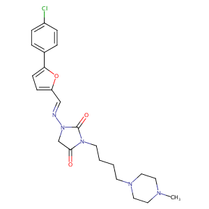 InChI=1S/C23H28ClN5O3/c1-26-12-14-27(15-13-26)10-2-3-11-28-22(30)17-29(23(28)31)25-16-20-8-9-21(32-20)18-4-6-19(24)7-5-18/h4-9,16H,2-3,10-15,17H2,1H3/b25-16+