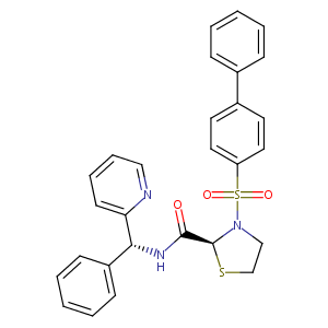 InChI=1S/C28H25N3O3S2/c32-27(30-26(23-11-5-2-6-12-23)25-13-7-8-18-29-25)28-31(19-20-35-28)36(33,34)24-16-14-22(15-17-24)21-9-3-1-4-10-21/h1-18,26,28H,19-20H2,(H,30,32)/t26-,28+/m1/s1