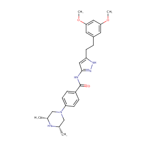 InChI=1S/C26H33N5O3/c1-17-15-31(16-18(2)27-17)22-9-6-20(7-10-22)26(32)28-25-13-21(29-30-25)8-5-19-11-23(33-3)14-24(12-19)34-4/h6-7,9-14,17-18,27H,5,8,15-16H2,1-4H3,(H2,28,29,30,32)/t17-,18+
