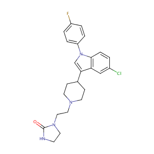InChI=1S/C24H26ClFN4O/c25-18-1-6-23-21(15-18)22(16-30(23)20-4-2-19(26)3-5-20)17-7-10-28(11-8-17)13-14-29-12-9-27-24(29)31/h1-6,15-17H,7-14H2,(H,27,31)