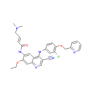 CCOC1=C(C=C2C(=C1)N=CC(=C2NC3=CC(=C(C=C3)OCC4=CC=CC=N4)<br />Cl)C#N)NC(=O)C=CCN(C)C