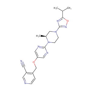 InChI=1S/C21H24N8O2/c1-14(2)19-26-21(27-31-19)28-6-7-29(15(3)12-28)20-24-10-18(11-25-20)30-13-16-4-5-23-9-17(16)8-22/h4-5,9-11,14-15H,6-7,12-13H2,1-3H3/t15-/m0/s1