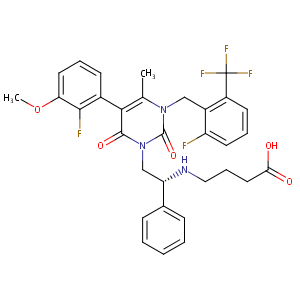 InChI=1S/C32H30F5N3O5/c1-19-28(21-11-6-14-26(45-2)29(21)34)30(43)40(18-25(20-9-4-3-5-10-20)38-16-8-15-27(41)42)31(44)39(19)17-22-23(32(35,36)37)12-7-13-24(22)33/h3-7,9-14,25,38H,8,15-18H2,1-2H3,(H,41,42)/t25-/m0/s1