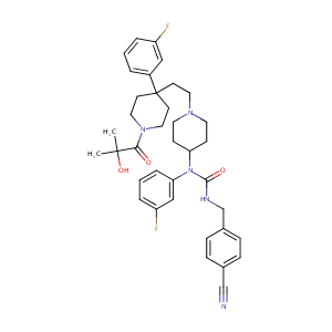 CC(C)(C(=O)N1CCC(CCN2CCC(CC2)N(C(=O)NCc2ccc(cc2)C#N)c2c<br />c(ccc2)F)(c2cccc(c2)F)CC1)O