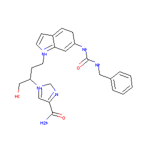 1S/C24H26N6O3/c25-23(32)21-14-30(16-27-21)20(15-31)9-11-29-10-8-18-6-7-19(12-22(18)29)28-24(33)26-13-17-4-2-1-3-5-17/h1-6,8,10,12,14,20,31H,7,9,11,13,15-16H2,(H2-,25,26,32,33)/p+2/t20-/m1/s1