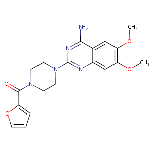 Furazosin; Justac; Lentopres; Prazocin; Prazosina; Prazosine; Prazosinum; Prazosin HCl; TNP00312; CP-12299; Hypovase (TN); Minipress (TN); Prazosin (INN); Prazosin [INN:BAN]; Prazosina [INN-Spanish]; Prazosine [INN-French]; Prazosinum [INN-Latin]; Vasoflex (TN); [3H]-Prazosin; [4-(4-amino-6,7-dimethoxyquinazolin-2-yl)piperazin-1-yl](furan-2-yl)methanone; [4-(4-amino-6,7-dimethoxy-quinazolin-2-yl)piperazin-1-yl]-(2-furyl)methanone; [4-(4-amino-6,7-dimethoxyquinazolin-2-yl)piperazin-1-yl]-(furan-2-yl)methanone; Piperazine,1-(4-amino-6,7-dimethoxy-2-quinazolinyl)-4-(2-furanylcarbonyl)-(9CI); Piperazine, 1-(4-amino-6,7-dimethoxy-2-quinazolinyl)-4-(2-furoyl)-(8CI); 1-(3-Amino-6,7-dimethoxy-2-quinazolinyl)-4-(2-furanyl-carbonyl)piperazine hydrochloride; 1-(4-Amino-6,7-dimethoxy-2-quinazolinyl)-4-(2-furanylcarbonyl) piperazine; 1-(4-Amino-6,7-dimethoxy-2-quinazolinyl)-4-(2-furanylcarbonyl)piperazine; 2-(4-(2-Furoyl)piperazin-1-yl)-4-amino-6,7-dimethoxyquinazoline; 2-[4-(2-furoyl)piperazin-1-yl]-6,7-dimethoxyquinazolin-4-amine; 4-(4-Amino-6,7-dimethoxyquinazolin-2-yl)piperazinyl 2-furyl ketone