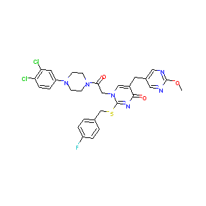 COC1=NC=C(C=N1)CC2=CN(C(=NC2=O)SCC3=CC=C(C=C3)F)CC(=O)N<br />4CCN(CC4)C5=CC(=C(C=C5)Cl)Cl