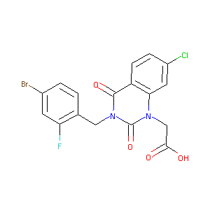 C1=CC2=C(C=C1Cl)N(C(=O)N(C2=O)CC3=C(C=C(C=C3)Br)F)CC(=O<br />)O