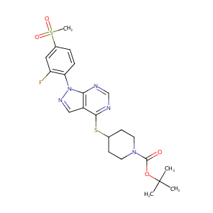 InChI=1S/C22H26FN5O4S2/c1-22(2,3)32-21(29)27-9-7-14(8-10-27)33-20-16-12-26-28(19(16)24-13-25-20)18-6-5-15(11-17(18)23)34(4,30)31/h5-6,11-14H,7-10H2,1-4H3