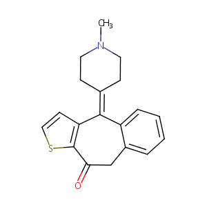 Ketotifene; Ketotifeno; Ketotifenum; Ketotifin; Ketotiphen; Ketotiphene; Zaditor; Ketotifene fumarate; Alaway (TN); HC 20-511; Ketotifen (INN); Ketotifen [INN:BAN]; Ketotifene [INN-French]; Ketotifeno [INN-Spanish]; Ketotifenum [INN-Latin]; Zaditor (TN); 10H-Benzo[4,5]cyclohepta[1,2-b]thiophen-10-one, 4,9-dihydro-4-(1-methyl-4-piperidinylidene)-, (2E)-2-butenedioate (1:1); 4,9-Dihydro-4-(1-methyl-4-piperidinylidene)-10H-benzo(4,5)cyclohepta(1,2-b)thiophen-10-one; 4,9-Dihydro-4-(1-methyl-4-piperidylidene)-10H-benzo(4,5)-cyclohepta(1,2-b)thiophen-10-one; 4-(1-Methyl-4-piperidylidene)-9-hydrobenzo[a]thiopheno[3,2-d][7]annulen-10-one; 4-(1-Methyl-piperidin-4-ylidene)-4,9-dihydro-1-thia-benzo[f]azulen-10-one; 4-(1-methylpiperidin-4-ylidene)-4,9-dihydro-10H-benzo[4,5]cyclohepta[1,2-b]thiophen-10-one
