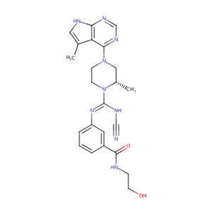InChI=1S/C23H27N9O2/c1-15-11-26-20-19(15)21(29-14-28-20)31-7-8-32(16(2)12-31)23(27-13-24)30-18-5-3-4-17(10-18)22(34)25-6-9-33/h3-5,10-11,14,16,33H,6-9,12H2,1-2H3,(H,25,34)(H,27,30)(H,26,28,29)/t16-/m0/s1